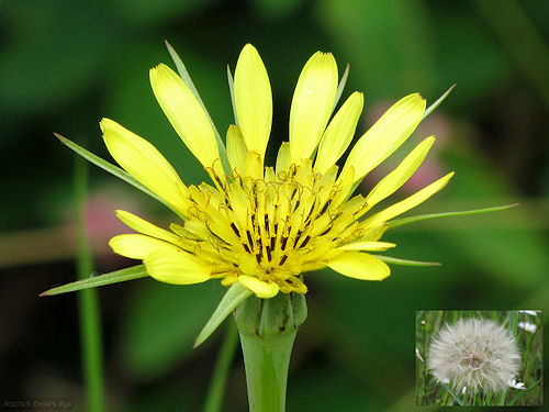Salsify is an introduced species. The plant often stands three feet or taller, and the huge seed heads resemble a dandelion on steroids (inset). They are wonderful for dried arrangements. Spray them with varnish or hair spray to keep the fuzzies from falling.