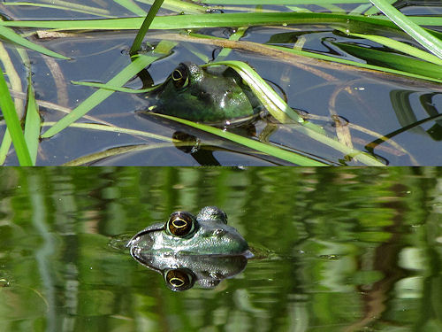 By the time I got back (the car was a quarter mile away), a few frogs had returned. Again, my descent to the water's edge was punctuated by enormous splashes. I set up the tripod and planted my feet in one spot, determined not to move until at least one frog made an appearance. After all, I was going to be there a while, but I knew I had to be perfectly still to have any chance of capturing one in the lens. I got sidetracked listening to Yellowthroats chanting, "Wickedoo-wickedoo-wickedoo, WEET!" and shifted my weight. Splash! A foot from my foot, a bullfrog dived into the water. I hadn't known he was there.